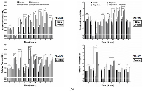 We next wanted to test whether mPR-specific PRG actions would affect the in vitro permeability of two different EC lines, nPR(+) Eahy926 ECs, derived from HUVECs, and nPR(−) RBMVECs. Although increased levels of permeability were initially observed in both ECs (on Collagen-I coated wells (Figure 2A, bottom panels), the permeability of nPR(+) Eahy926 ECs was back to normal after 12 h (Figure 2, bottom right panel), while being continuously enhanced among all sex hormone treatments for nPR(−) RBMVECs (Figure 2A, bottom left panel) on Collagen-I coated wells, indicating that the permeability of nPR(−) ECs is more susceptible to steroid hormones via the CmP axis (Figure 2A, bottom panels) through the CSC-modulated β1-integrin signaling [18,19,20]. Interestingly, permeability remained continuously enhanced among all sex hormone treatments for nPR(−) RBMVECs, when cultured in the absence of collagen-I (Figure 2A, upper left panel), while the permeability of Eahy926 ECs returned to normal after 48 h (Figure 2A, upper right panel), further supporting the important role of β1-integrin-mediated signaling within the CSC-mPRs-PRG-nPRs (CmPn) signaling network in nPR(+) Eahy926 ECs, but not with the CmP signaling network in nPR(−) RBMVECs.