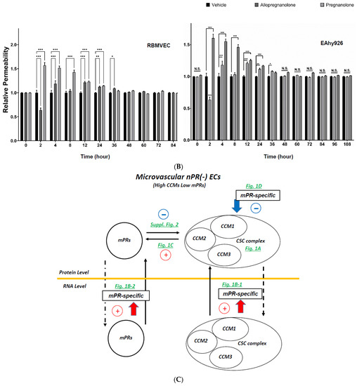 Some common neurosteroids are synthesized from PRG (or named as PRG metabolites), such as allopregnanolone (3a-hydroxy-5a-pregnan-20-one, ALLO) and pregnanolone (3a-hydroxy-5b-pregnan-20-one, P5). Like PRG, neurosteroids can suppress inflammation, reduce apoptosis, and promote neurogenesis and myelination in the nervous system [21], with many potential therapeutic applications [22]. When increased reactive oxygen species production occurs followed by neuroinflammation, levels of several common neurosteroids, such as PRG (P4), ALLO, and P5, can be drastically increased in response to oxidative damage [23], further reaffirming their neuroprotective roles. In fact, ALLO can elicit its marked anxiolytic, antistress, and antidepressant effects at very low (nanomolar) concentrations [24], and the neuroprotective effects of ALLO are mediated through mPRs [21]; therefore, neurosteroids can evoke mPR-specific actions. We then investigated the permeability of two nPR(+/−) ECs (using the early used parameters) under exposure to two aforementioned neurosteroids (ALLO, 20 µM; P5, 20 µM), respectively, in parallel with the vehicle control. The binding affinity data showed that as a neurosteroid, PRG has a 5–100-fold higher affinity to mPRs than its own two metabolites (ALLO and P5) [25], which is reflected by the significantly shortened negative effects of neurosteroids on the permeability of microvascular ECs in general (Figure 2B), compared to mPR-specific sex steroid treatments (Figure 2A, lower panel). These data indicate that neurosteroids also exert their cellular responses via mPR-specific actions, and the duration of steroid-induced mPR actions (BBB perturbation) is determined by their corresponding binding affinities to mPRs, regardless of the existence of nPRs (Figure 2B). Therefore, our data indicate neurosteroids also evoke mPR-specific PRG actions (Figure 2B). In sum, our in vitro findings of neurosteroid-induced mPR-specific PRG actions leading to the increased permeability of nPR(−) ECs support a common regulatory mechanism of mPRs-specific actions on the maintenance of the BBB, independent of nPRs.