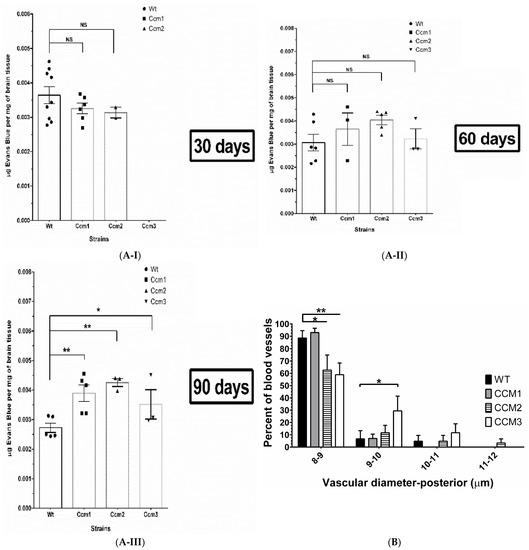 Using Evans blue dye (EBD), we quantitatively measured the permeability of blood vessels in the brain which is the major site for CCM pathology and BBB evaluation [33]. To test the presence of compromised permeability of blood vessels in the brain, resulting from vehicle injection, we initially examined EBD data between naïve (untreated with no-injections, N) and vehicle (injection of vehicle, peanut oil) groups among WT, Ccm1, and Ccm2 hemizygous mutant mice; a similar intensity of EBD signals among these control groups was seen (Supplementary Figure S4A), indicating no apparent influence of vehicle injection on the permeability of blood vessels in the brain. We then measured the permeability of blood vessels in the brain among all mouse strains, after treatment with mPR-specific PRG actions for 30, 60, and 90 days, respectively. A similar intensity of EBD signals among Ccm (1, 2, and 3) mutants and WT mice for both 30- and 60-day treatment groups was seen, identical to the naïve and vehicle control groups, suggesting no influence of genotypes on the permeability of blood vessels yet (Figure 3(A-I,A-II)). However, significantly increased permeability of the BBB was observed in all Ccms mutant mice in the 90-day treatment group compared to WT mice, indicating that the BBB was initially resistant to the disrupting pressure from mPR-specific PRG actions, but eventually collapsed for all Ccm mutants due to chronic exposure to mPR-specific PRG actions over a 90-day treatment period (Figure 3(A-III)).