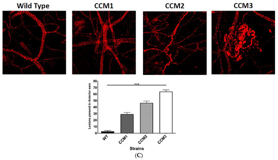 Ear collection and preparation: The procedure was performed as described before [97]. Briefly, whole ears were collected from WT (C57 BL/6 J) and Ccm1+/−, Ccm2+/−, and Ccm3+/− hemizygous mutant mice after being treated for 90 days with mPR-specific PRG treatment or vehicle control or left untreated as a naïve control. Ears were kept frozen at −80 °C and thawed at 4 °C before preparation. Ears were placed in Hank’s balanced salt solution (HBSS) so that hairs and excess tissue could be removed with scissors under a dissection microscope. Posterior and anterior leaflets of the ears were separated with each leaflet being placed in a separate 24-well plate with 1 mL of 4% paraformaldehyde (PFA) at 4 °C for 15 min. Ears were washed with 1 mL PBS with 0.2% triton X-100 (washing buffer); then, remaining cartilage and hair were removed and washed again before proceeding to staining procedures.