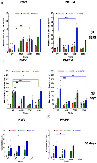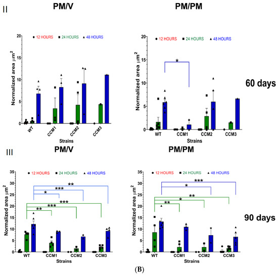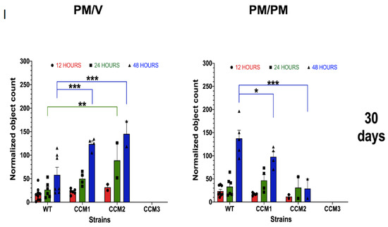 Overall ex vivo angiogenic performance of nPR(−) ECs derived from dorsal aortae of Ccms mice under mPR-specific PRG actions. After euthanizing, dorsal aortae were immediately removed from Ccm1+/−, Ccm2+/−, and Ccm3+/− hemizygous mutant and WT (C57 BL/6 J) mice treated for 30, 60, or 90 days and were divided in half and placed in matrigel media supplemented with vehicle (V, DMSO + EtOH left panels) or mPR-specific PRG treatment (PM, progesterone + mifepristone, 20 µM each, right panels). Images were acquired in 2 h intervals on a Nikon Biostation CT for 72 h. After acquisition, quantification of cell numbers (measured by object counts using the NIKON elements software) was conducted on images taken at 12 (red), 24 (green), and 48 h (blue) timepoints. Quantification of de novo ECs generated from ex vivo angiogenesis (A). (A-I) Ccm1 mice displayed significantly increased cell counts at 48 h, while Ccm2 mice displayed significantly increased cell counts at 24 and 48 h when compared to WT among all 30-day PM in vivo treatment groups in vehicle matrigel media ex vivo (left panel, PM/V); the same 30-day treatment group showed a significant decrease in cell counts at 48 h in Ccm1 and Ccm2 mice compared to WT in hormone-supplemented matrigel media ex vivo, (right panel, PM/PM). (A-II) There were significant increases in cell counts at 24 h in Ccm1 and Ccm2 mice compared to WT among all 60-day treatment groups in vehicle matrigel media ex vivo (left panel), while 60-day treatment only displayed significantly increased counts at 48 h in Ccm2 mice compared to WT in mPR-specific PRG-supplemented matrigel media ex vivo (right panel). (A-III) There was a significant decrease among all 90-day treatment groups in vehicle matrigel media ex vivo at 24 h while only Ccm2 displayed significantly decreased cell counts at 48 h compared to WT (left panel); the same 90-day treatment group only displayed significant decreases in cell counts at 48 h for Ccm1 and Ccm3 strains when compared to WT in mPR-specific PRG-supplemented matrigel media ex vivo (right panel). Overall angiogenic performance of nPR(−) ECs (B). After acquisition, analysis of cell growth and migration was measured by area of ECs (using the NIKON elements software) on images taken at 12, 24, and 48 h timepoints. (B-I) ECs derived from Ccm2 mice aortae displayed significant increased growth when compared to WT among all 30-day treatment groups in vehicle matrigel media ex vivo (left panel), while 30-day treatment showed a significant decrease in angiogenesis at 48 h in Ccm1 mice compared to WT in mPR-specific PRG-supplemented matrigel media ex vivo (right panel). (B-II) There were no statistically significant differences among all 60-day treatment groups in vehicle matrigel media ex vivo (left panel), while 60-day treatment showed a significant decrease in angiogenesis at 48 h in Ccm1 mice compared to WT (same as 30 day) in mPR-specific PRG-supplemented matrigel media ex vivo (right panel). (B-III) There was a significant decrease among all 90-day treatment groups in vehicle matrigel media ex vivo at 24 and 48 h compared to WT (left panel), while 90-day treatment also showed significant decreases in angiogenesis at 24 and 48 h (excluding Ccm1 at 48 h) when compared to WT in mPR-specific PRG-supplemented matrigel media ex vivo (right panel). Cell count data were normalized by dividing cell counts by the length of the aortic vessel (μM). Angiogenesis area measurements (μm2) were normalized by dividing growth area by the area of the aortic vessel (μm2). Statistical significance was performed using two-way ANOVA (*, **, and *** above graphs indicate p ≤ 0.05, 0.01, and 0.001, respectively) and comparisons are color-coded with each time point for clarification. Each symbol represents individual mice samples, which varies by strain (n = 1–8).