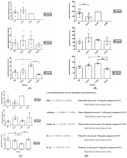 Biomarkers associated with BBB disruption defined in Ccms mutant mice. Our data clearly demonstrated that there is a correlation between serum levels of PRG and the initiation of BBB disruption in hemizygous Ccms mutant mice. Furthermore, four more biomarkers (SerpinA6, IL-12, IL-6, and Albumin) are all associated with PRG homeostasis in serum, and also correlate well with a disrupted BBB in hemizygous Ccms mutant mice. Therefore, we hypothesize that these serum molecules can be used as etiological biomarkers to predict the timing of BBB leakage, the initiating steps in early hemorrhagic events in CCM pathology. We performed binomial regression with the serum concentration of these five biomarkers with the corresponding EBD levels for the same treatment groups temporally (0, 30, 60, and 90 days) to generate binomial correlation functions (Figure 6D). Each biomarker has a unique cutoff value indicating an elevated risk of BBB disruption. These predictive algorithms will be tested, improved, and validated through our ongoing collaborative human CCM biomarker trials.