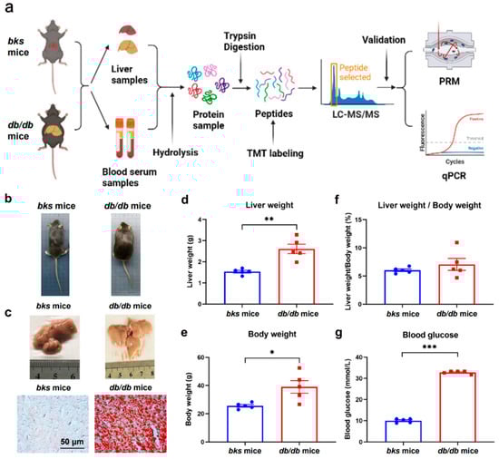 Study workflow and the validation of the genetic NAFLD mouse model. (a) Workflow chart; (b) Representative phages of db/db and bks mice (n = 5); (c) Representative liver phages and the corresponding Oil Red O staining of bks and db/db mice; (d) Liver weight, (e) body weight, (f) ratios of liver and body weight and (g) blood glucose of db/db mice and bks control group. Red dots represent bks mice and blue squares represent db/db mice. * p < 0.05; ** p < 0.01; *** p < 0.001.