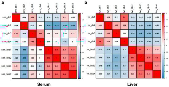 Sample repeatability analysis of quantitative serum total proteins for bks and db/db mice. Pearson’s correlation coefficients of the serum (a) and liver (b) represented the four repeats of bks mice distinguishing the repeats from db/db mice.
