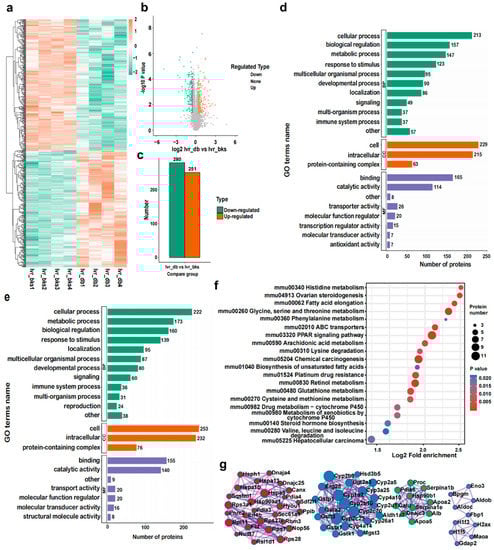 Identification and bioinformatics analysis of hepatic DEPs in db/db mice compared with bks mice. (a) Heatmap, (b) volcano, and (c) histogram depicting the distribution of the hepatic DEPs in db/db mice compared with bks mice. GO (BP) analysis of (d) the upregulated proteins and (e) downregulated hepatic proteins in db/db mice compared with bks mice. (f) KEGG pathway analysis of upregulated DEPs in the mouse liver. (g) PPI network of the optimized upregulated and downregulated DEPs in the mouse liver.
