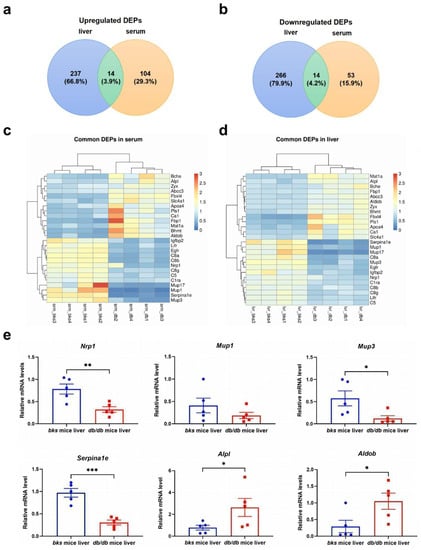 Because proteins secrete from the liver and are released into the blood they may accurately represent the status of liver injury or steatosis when detected in the liver and serum [9], the validation of commonly expressed proteins in the liver and serum benefits the discovery of NAFLD biomarkers. Among the DEPs in the serum and liver samples of db/db mice and the control group, except for 2 uncharacterized proteins, we found 13 commonly upregulated DEPs and 13 downregulated DEPs (Figure 5a,b). Figure 5c,d show the heatmap of common upregulated DEPs in the serum and the liver, the proteins are listed as follows: methionine adenosyltransferase 1A (MAT1A), alkaline phosphatase (ALPL), butyrylcholinesterase (BCHE), fructose-1,6-bisphosphatase 1 (FBP1), canalicular multispecific organic anion transporter 2 (ABCC3), fructose-bisphosphate aldolase B (ALDOB), zyxin (ZYX), betaine (BHMT), F-box/LRR-repeat protein 4 (FBXL4), plastin-1 (PLS1), apolipoprotein A-IV (APOA4), carbonic anhydrase 1 (CA1), and solute carrier family 4 (anion exchanger), member 1 (SLC4A1). Additionally, the commonly downregulated DEPs are listed as follows: alpha-1-antitrypsin 1–5 (SERPINA1E), major urinary protein 1 (MUP1), major urinary protein 17 (MUP17), major urinary protein 3 (MUP3), epidermal growth factor receptor (EGFR), insulin-like growth factor-binding protein 2 (IGFBP2), neuropilin-1 (NRP1), leukemia inhibitory factor receptor (LIFR), complement C1r-A (C1RA), complement C5 (C5), complement component C8 alpha chain (C8A), complement component C8 beta chain (C8B), and complement component C8 gamma chain (C8G). Moreover, as core commonly DEPs in the liver and serum, the downregulated DEPs, such as NRP1, MUP3, SERPINA1E, and IGFBP2, and upregulated DEPs, such as ALPL and ALDOB were verified at the mRNA level in the liver samples by qPCR. The results show that the mRNA levels of Nrp1, Mup3, and Serpina1e were significantly downregulated whereas Alpl and Aldob were significantly upregulated in the db/db mice compared with the bks mice group (Figure 5e). To summarize, these results suggest that the trend of mRNA expression was consistent with that of proteomic analysis among the commonly regulated DEPs.