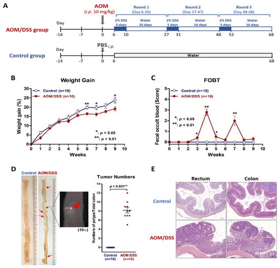 The murine colitis and colorectal cancer model using AOM/DSS on BALB/c mice. (A) The experimental AOM/DSS protocol for induction of colitis/colorectal cancer. (B) The weight gain of mice in the AOM/DSS group increased more slowly than that in control group. (C) Fecal occult blood turned positive since the third week of protocol in the AOM/DSS group but not in the control group. (D) The gross appearance of the whole colon in the AOM/DSS group showed colitis and developed colon neoplasms after the third round of DSS. (E) Microscopic examination in H&E staining showed inflammation and neoplasms in the colon in the AOM/DSS group but not in the control group. * p < 0.05; ** p < 0.01.