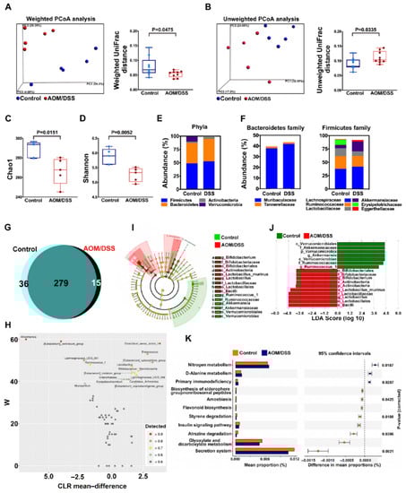 The analysis of fecal microbiota between the AOM/DSS group and control group. (A) Weighted and (B) unweighted PCoA analysis revealed different β diversity between the two groups including sequence distances and abundance. (C) Chao1 boxplot and (D) Shannon boxplot showed different α diversity between the two groups. (E) The expressions of the four major phyla between the two groups. (F) The expression of each family from Bacteroidetes and Firmicutes between the two groups. (G) Venn diagram and (H) ANCOM results revealed different microbial composition and abundance between the two groups. (I) Cladogram and (J) LDA score selected different and predominant bacteria between the two groups. (K) The fecal microbiomes between the two groups go on different metabolic pathways especially in the secretion system, glyoxylate and dicarboxylate metabolism, and nitrogen metabolism.