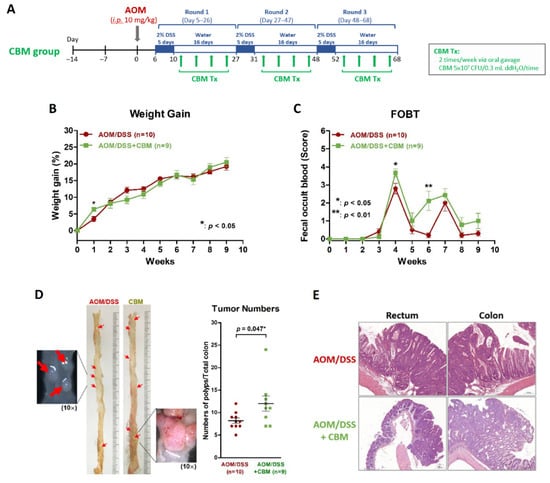 We added CBM intervention (5.0 × 107 CFU) to the AOM/DSS mice via oral gavage twice a week after each round of DSS administration (four times/round) for three rounds (Figure 3A) to investigate if probiotics could inhibit the development of colitis and colitis-associated neoplasms. We found the body weight gain of mice did not differ between the AOM/DSS + CBM group and AOM/DSS group (Figure 3B). At the third week of the protocol, FOBT began to show positivity in both groups. The scores of FOBT were higher in the AOM/DSS + CBM group than in the AOM/DSS group at the 4th week and 6th week of the protocol (Figure 3C). Gross appearance of the colon showed colitis and neoplasms in both groups and the number of neoplasms in the AOM/DSS + CBM group was more than those in the AOM/DSS group (p = 0.047, Figure 3D). Microscopic examination showed inflammation and neoplasms in the rectum and colon in both groups (Figure 3E). These observations demonstrated CBM intervention did not improve colitis or prevent colitis-associated neoplasms in AOM/DSS mice.