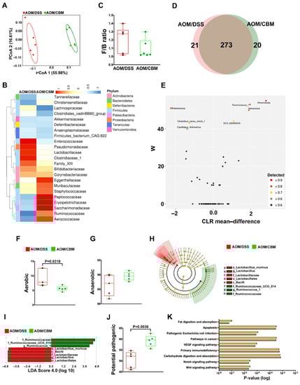The analysis of fecal microbiota between the AOM/DSS + CBM group (AOM/CBM) and AOM/DSS group (AOM/DSS). (A) PCoA analysis revealed different β diversity between the two groups. (B) The heatmap showed different microbial compositions between the two groups. (C) F/B ratio showed the ratio of Firmicutes/Bacteroidetes between the two groups. (D) Venn diagram and (E) ANCOM results revealed different microbial compositions and abundances between the two groups. (F,G) Aerobic and anaerobic expressions of fecal microbiota between the two groups. (H) Cladogram and (I) LDA score selected different and predominant bacteria between the two groups. (J) The fecal microbial composition in AOM/DSS + CBM group showed more potentially pathogenic than that in AOM/DSS group. (K) The expression of each metabolic pathway in the microbiomes from the two groups.