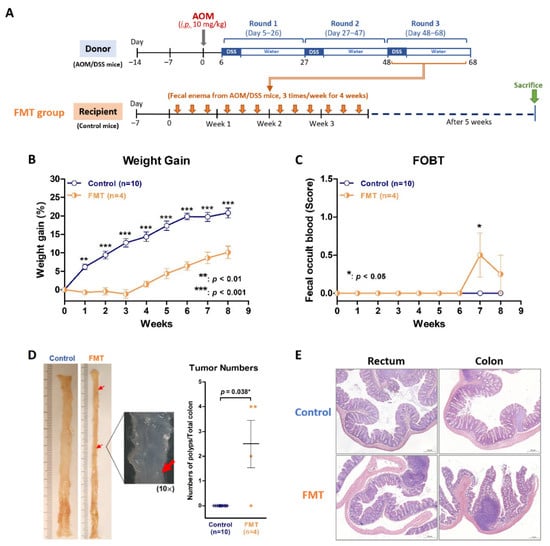 Inverse fecal microbiota transplantation (inverse FMT) from AOM/DSS mice to normal recipient mice. (A) The protocol of inverse FMT experiment. (B) The body weight gains were significantly lower in FMT recipient mice than those in control mice. (C) Fecal occult blood turned positive at the seventh week of protocol in FMT recipients. (D) Gross appearance showed inflammation and neoplasm polyps in the colon of FMT recipients. (E) Microscopic examinations in H&E staining revealed inflammation or neoplasms in the rectum and colon of FMT recipients. * p < 0.05; ** p < 0.01; *** p < 0.001.