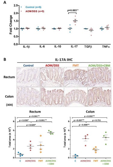 The expression of IL-17A in colon tissues from control, AOM/DSS, FMT, and AOM/DSS + CBM groups. (A) Screening the gene expression of in pro-inflammatory (IL-1β, IL-6, IL-17, and TNFα) and anti-inflammatory cytokines (IL-10 and TGFβ) in colon tissues using qPCR. Up-regulated IL-17 expression (p = 0.003) was observed in the AOM/DSS group when compared to the control group. The expressions of IL-1β, IL-6, IL-10, TGFβ, and TNFα were similar between the two groups. (B) Further validation using IL-17A IHC staining demonstrated a predominant expression of IL-17A in AOM/DSS, FMT, and AOM/DSS + CBM groups but not in the control group. The IL-17A-positive areas were calculated using ImageJ software. In the AOM/DSS + CBM group, the expression of IL-17A was significantly higher than in AOM/DSS group in the rectum (p < 0.001). * p < 0.05; ** p < 0.01.