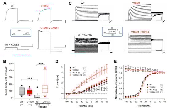 KCNQ1 variant V185M leads to high current densities in cells expressing KCNQ1-KCNE2 (Q1E2) heteromers. Whole-cell membrane currents were recorded in CHO cells expressing wild-type (WT) or V185M KCNQ1 channels alone or together with KCNE2. (A) Typical current traces recorded with a 500 ms test pulse to 40 mV. (B) Distribution of current densities determined with test pulses shortly after break-through. Asterisks indicate significant differences between groups; *** p < 0.001. (C) Typical families of current traces obtained with the indicated standard double pulse protocol, consisting of a 2 s variable P1 pulse and a constant P2 pulse to 0 mV. (D) Current amplitudes (means ± SEM) at the end of the 2 s P1 pulse plotted against P1 potential. (E) Conductance–voltage (GV) relation: normalized instantaneous P2 current amplitudes (means ± SEM) plotted against P1 potential. Numbers of experiments in (B,D,E) are given in parentheses; scale bars in (A,C) denote 0.5 nA and 0.5 s; standard extracellular (ECS) and intracellular solution (ICS). WT: WT KCNQ1; V185M: V185M-KCNQ1.