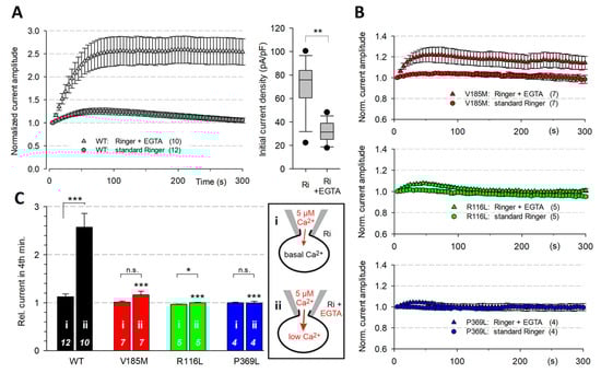 Ca2+ sensitivity of WT KCNQ1 channels is blunted in the mutant channels. Whole-cell recordings were performed using high-Ca2+ ICS in CHO cells expressing KCNQ1 channels without overexpression of CaM. Cells were pre-incubated for at least 30 min in normal (i) or EGTA-Ringer solution (ii). (A) Time course of WT KCNQ1 current amplitudes traced with a 500 ms test pulse to 40 mV (left panel). Normalized current amplitudes (means ± SEM) for experiments in standard or EGTA-Ringer as ECS. Initial current densities were significantly lower in EGTA-Ringer compared to standard ECS (right panel; ** p < 0.01). (B) Time course of normalized current amplitudes (means ± SEM) for experiments on V185M-, R116L- and P369L-KCNQ1 channels in standard or EGTA-Ringer as ECS. (C) Comparison of the effects of pre-incubation in EGTA-Ringer on the changes in relative current amplitude for WT and mutant KCNQ1 channels. Asterisks directly above a box indicate significant differences in relative current amplitudes of mutant KCNQ1 channels compared to the WT data obtained under the same experimental conditions. Other asterisks indicate significant differences between conditions “i” and “ii” (see schematic drawings). *** p < 0.001; * p < 0.05; n.s., not significant; numbers of experiments are shown in the bars.