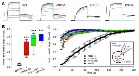 To reduce the intracellular Ca2+ levels in intact cells even further, CHO cells were loaded with BAPTA by BAPTA-AM pre-incubation. This treatment almost abolished the initial WT KCNQ1 current and led to drastic relative increases in K+ current amplitudes during Ca2+ loading via the recording pipette (Figure 5A–C). BAPTA loading of cells expressing the mutant KCNQ1 channels led to significantly higher relative initial current amplitudes and a much faster time course of current restoration upon Ca2+ loading. Again, the R116L and P369L mutants were less affected by the reduction of intracellular Ca2+ than the V185M mutant. In summary, these data strongly suggest that all three identified missense variants impair the Ca2+ sensitivity of the KCNQ1 channel and stress the necessity of at least normal resting Ca2+ levels for effectively coupling voltage sensor activation to channel opening in WT KCNQ1 channels.