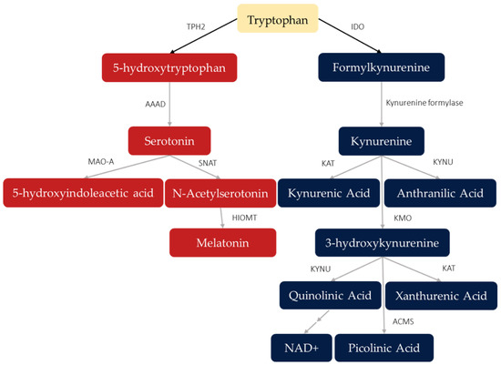 Products of tryptophan metabolism via serotonin (red) and kynurenine (blue) pathways. Arrows point toward the direction of metabolism as mediated by different enzymes or other catalysts, with fields showing metabolites produced along these pathways. Double arrows indicate multiple metabolic steps (catalysts not shown). Abbreviations: TPH2: tryptophan hydroxylase, isoenzyme 2; AAAD: aromatic acid decarboxylase; MAO-A: monoamine oxidase A; HIOMT: hydroxyindole O-methyl transferase; SNAT: serotonin-N-acetyltransferase; IDO: indoleamine 2,3-dioxyenase; KAT: kynurenine aminotransferase; KMO: kynurenine 3-monooxygenase; KYNU: kynurinase; ACMS: 2-amino-3-carboxymuconic-6-semialdehyde decarboxylase.