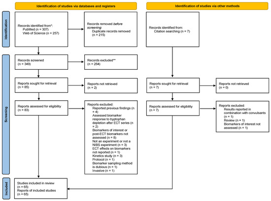 Inclusion criteria were (1) treatment with ECT, rTMS, or tDCS; (2) participants were human and non-human species; (3) levels of the following biomarkers were assessed using any form of biological sample collection from NIBS-treated participants: tryptophan (TRP), kynurenine (KYN), formylkynurenine, quinolinic acid (QA), NAD+, 3-hydroxykynurenine (3-HK), xanthurenic acid (XA), picolinic acid (PA), anthranilic acid (AA), serotonin (5-HT), oxitriptan, 5-hydroxytryptamine (5-HT), 5-hydroxyindoleacetic acid (5-HIAA), N-acetyl-5-HT, and melatonin; 4) effects of NIBS on biomarkers of interest levels was assessed by comparing baseline with concurrent or post-NIBS levels, without restriction to timepoints of sampling. Exclusion criteria were (1) no new findings were published or data was previously reported. Otherwise, there were no further restrictions on experimental design, the language the manuscript was written-in, NIBS parameters or targets, participant characteristics such as age or diagnosis, nor restrictions on sampling method were considered. The rationale for these relaxed restrictions was to maximize the number of included studies for this survey, as we anticipated this literature to be sparse.