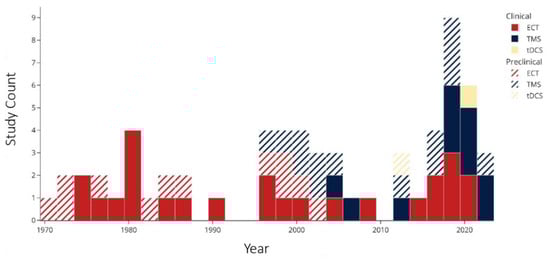 Publication year of included studies. Abbreviations: ECT: electroconvulsive therapy; TMS: transcranial magnetic stimulation; tDCS: transcranial direct current stimulation.