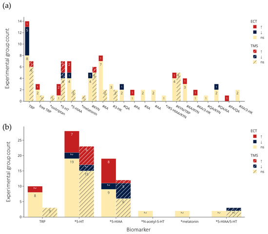 Results from clinical and preclinical studies were visualized as bar charts where the counts for significant changes, in either direction, and nonsignificant changes were stacked to present an overview of the effects of NIBS and biomarkers of TRP metabolism. In this synthesis, we stacked studies assessing the same metabolite and NIBS technique (i.e., ECT, rTMS, or tDCS). That is, we differentiated clinical and preclinical studies and NIBS, but did not perform subgroup analyses of all ways in which these studies vary, for example, dissimilar NIBS parameters. Instead, when patterns suggesting heterogeneity or true effects emerged, we agreed to follow them up by examining the characteristics of the relevant studies.