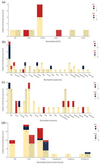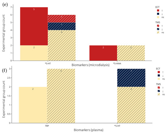 Figure 4a,b and Figure 5a–f visualize results of the counts of experimental groups with significant or nonsignificant changes in biomarkers of TRP metabolism, with the latter organized according to sampling medium. Figure 5a–c show examinations of CSF (a), plasma (b), serum (c) in clinical studies, and Figure 5d–f show brain tissue (d), microdialysis (e), and plasma (f) in preclinical studies. The sampling results of brain tissue and microdialysis involved various regions but are collapsed in Figure 5d and e for brevity; they are shown individually in Figure S1. Moreover, for brevity, only ECT and TMS results are visualized, and readers are referred to the bottom of Table 2 and Table 3 for the single clinical or preclinical tDCS study, respectively. For a more detailed report on the qualitative analysis of the methods and results in clinical and preclinical studies, see supplementary text.