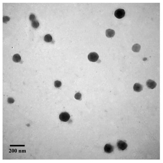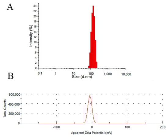 The micelle with enzyme response and active targeting prepared with TPGS3350-GPLGVRGDG-DOX prodrug was P1, the micelle with enzyme response fabricated by TPGS3350-GPLGVRG-DOX prodrug (GPLGVRG is Gly-Pro-Leu-Gly-Val-Arg-Gly) was P2, and the micelles from TPGS3350-DOX prodrug were P3. The morphologies of P1 were collected by transmission electron microscope (TEM) (Figure 2), from which it could be found that P1 exhibited a relatively homogeneous spherical morphology with an average size of about 130 nm. The dynamic light scattering (DLS) data in Figure 3A indicates that the particle size of P1 was 140.6 ± 3.2 nm, which was slightly larger than that in TEM. It was reported that micelles with a particle size less than 200 nm could achieve long circulation in vivo and accumulate more readily in tumor sites via EPR effects [16]. The zeta potential of P1 was –4.97 mV (Figure 3B), which indicates that P1 would be stable in aqueous solutions. Additionally, the critical micelle concentration (CMC) of P1 was determined to be 5.71 × 10−3 mg/mL, which facilitated the stability in blood circulation. The drug loading contents (DLC) of P1, P2, and P3 were 12.45%, 10.63%, and 12.07%, and the drug encapsulation efficiency (DEE) were 61.49%, 53.87%, and 59.51%, respectively. The DLC and DEE values for P1, P2 and P3 are similar.