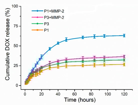 Figure 4 illustrates the cumulative in vitro DOX release of P1 and P3 with or without MMP-2 enzyme in 120 h at 37 °C in Phosphate-Buffered Saline (PBS). After incubation with the MMP-2 enzyme for 120 h, 63.13% of DOX in P1 was released with a significantly higher cumulative release than the other three groups. P1 had MMP-2 enzyme-responsive properties and achieved responsive breakage of peptide fragments, resulting in an increasing release of DOX. In contrast, only 36.63% of DOX in P3 was released in the presence of MMP-2 after 120 h. Furthermore, approximately 30% of DOX was released in the other two groups without MMP-2. It was confirmed that P1 was stable in the normal physiological environment of the human body and had the ability to bind DOX without releasing the drug prematurely.