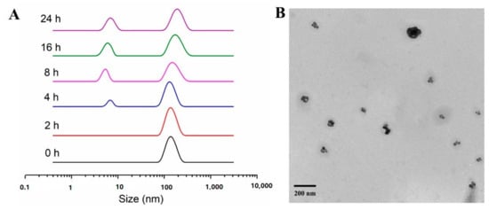 The enzymatic reaction behavior of MMP-2 was verified by adding appropriate amounts of type IV collagenase to P1. The change in the particle size of P1 was measured by a laser particle size analyzer and the particle size morphology was observed by TEM after the enzymatic reaction.