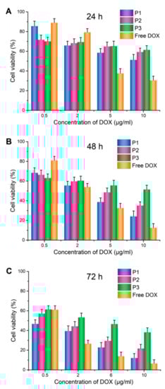 To verify the effectiveness of P1, the cytotoxicity of different drug concentrations and dosage forms on 4T1 cells (mouse breast cancer cells) was measured with CCK-8 assays. A medium containing P1, P2, P3, and free DOX was added to each well. Then, 24 h, 48 h, and 72 h later, the absorbance of each well was measured at 450 nm using a microplate reader (Perkin-Elmer Victor III, Elkin, NC, USA).