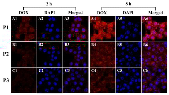The cellular uptake of 4T1 cells was recorded by using Confocal Laser Scanning Microscopy (CLSM). In Figure 7, there was a strong red fluorescence in the cytoplasm, surrounding the nucleus (blue) after P1 was incubated with 4T1 cells for 2 h. This phenomenon indicates that the DOX-loaded micelles were effectively taken up by the tumor cells. Furthermore, a stronger red fluorescence of P1 was observed, compared to P2 and P3 after 2 h and 8 h incubation with 4T1 cells, which reveals that P1 exhibited efficient cellular internalization. Consequently, the size of P1 was reduced by the effect of the MMP-2 enzyme to remove the outer layer of PEG. At the same time, the targeting peptide bound to the αvβ3 integrin receptor was overexpressed on the surface of the tumor cells, leading to more P1 entering into cells via the receptor-mediated endocytosis pathway.