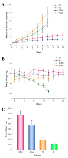 (A) Changes in tumor volume after intravenous injection of P1, P2, DOX, and PBS (Small arrows refer to the time of administration in mice). (B) The changes of body weight. (C) Final tumor weights.