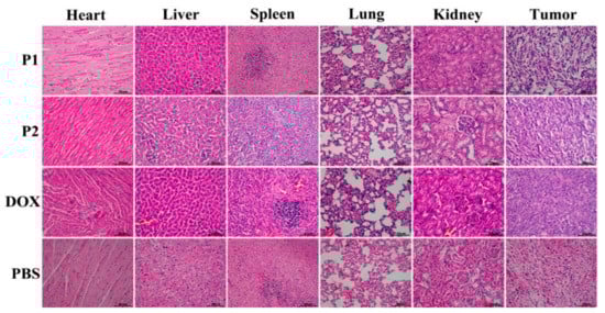 To further evaluate antitumor effect of micelles, tumors and major organs were stained with H&E after being treated with different formulations. As shown in Figure 9, tumor tissues illustrate varying degrees of apoptosis. The histological H&E staining results indicated that the suppression effect of P1 was much better than that of other groups. Specifically, the percentage of apoptotic cells in tumors treated with P1 was much higher than that in tumors treated with P2, DOX, and PBS. Meanwhile, the cell morphology in the rest of the major organ sections was normal. Therefore, P1 has an improved antitumor efficacy and reduced toxic effects on other normal tissues.