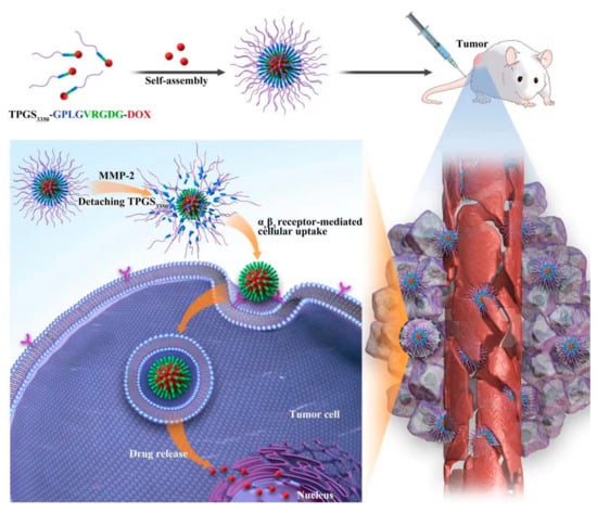 The liposomal formulation of DOX (Doxil®), for example, was the first nanomedicine to be approved by the US Food and Drug Administration (FDA), and it has a longer circulation time and lower toxicity than DOX [22]. However, studies found that conventional nanocarriers could not significantly improve the efficacy of chemotherapy due to their large size, slow drug release, and lack of active targeting. In addition, PEG modification was not conducive to the internalization of drugs, leading to a poor effect of anticancer [23,24]. To solve the above problems, researchers designed a variety of intelligent polymeric drug delivery systems to further improve the therapeutic effect [25,26,27,28]. Matrix metalloproteinases play an important role in tumor growth and metastasis [29,30]. Collagenase type IV, including MMP-2 and MMP-9, is one of these vital types [31]. It was highly expressed in almost all tumor tissues and secreted by tumor cells, which had obvious advantages in comparison with intracellular environment [32]. Recently, MMPs were widely used as an effective inducer of tumor imaging and drug release. However, the preparation of a delivery system with a well-defined structure remains a great challenge.
