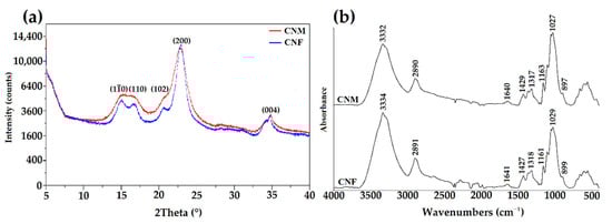 (a) The X-ray diffraction patterns and (b) ATR-FTIR spectra of CNM and CNF.