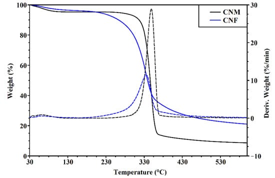 Thermogravimetry was used to determine the thermal stability of CNF and CNM. The TG and DTG curves of obtained samples are shown in Figure 3. CNF and CNM were characterized by two degradation stages, which agreed with previously reported studies [58]. For the CNF sample, the initial weight loss of 3.71% was observed at a temperature of 64 °C, while for the CNM sample, the first step of degradation was noticed at a temperature of 61 °C with a loss of 4.70% initial weight. This degradation step was related to the evaporation of water and volatile components present in the samples [59]. The main degradation stage for CNF with approximately 75% of the weight lost at 335 °C was received. A significant weight loss of 87% for the CNM sample occurred at 348 °C. This step of degradation of both samples might be related to the depolymerization of the obtained compounds [60].