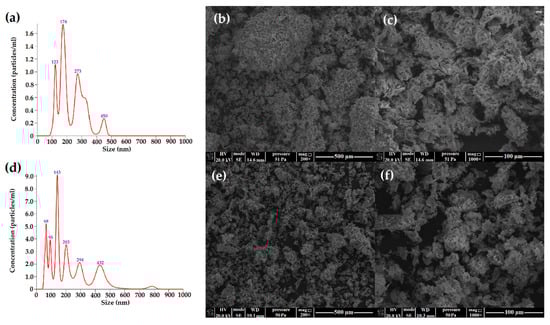 The size distributions and particle concentrations of cellulose nanocrystals from (a) fibrils and (d) microcrystalline cellulose and SEM images of (b,c) cellulose nanocrystals from fibrils and (e,f) microcrystalline cellulose with different magnification (200×, 1000×).