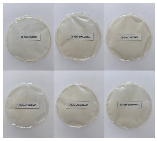 Biofilms were obtained from a blend of chitosan with gelatin in a volume ratio of 1:1, which were then cross-linked with two different agents (DNCL, DAMC). Here, 5, 10, and 15% addition of DNCL and DAMC was used. The names of all the obtained materials are coded as shown: chitosan—gelatin—percent addition of DAMC/DNCL, e.g., CS-Gel-5%DAMC/DNCL. All obtained biofilms were visually homogeneous (Figure 7), which was attributed to the interaction between the amine groups (NH3+) on chitosan chains in acidic solution and the carboxylic groups (COO¯) of gelatin. Additionally, –NH2 and -OH groups of chitosan may form hydrogen bonds with many polar groups in gelatin-like –COOH, –NH2, –OH. Chitosan and gelatin with cross-linkers formed a covalent bond. Moreover, strong electrostatic interactions and hydrogen bonds led to the formation of complexes between the components and the formation of the desired chitosan-gelatin materials cross-linked with DNCL and DAMC.