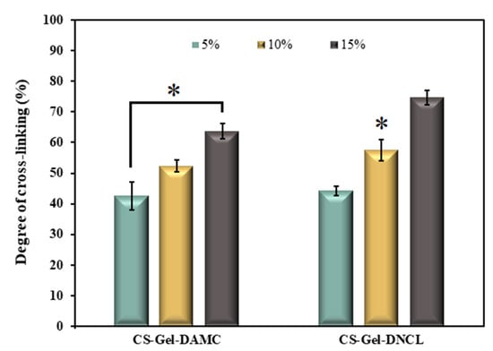 Degree of cross-linking of chitosan-gelatin (CS-Gel) cross-linked by 5%, 10%, and 15% adding DAMC and DNCL; n = 3; mean ± SD (SD—standard deviation); statistical significance is indicated with an asterisk: * p < 0.05.