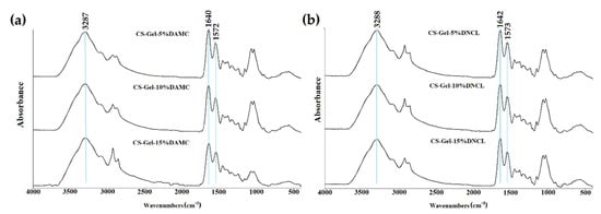 ATR-FTIR spectra of chitosan-gelatin cross-linked with (a) DAMC and (b) DNCL.