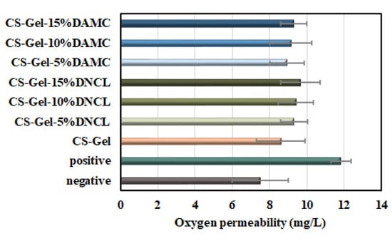 Oxygen permeability is a fundamental parameter of a wound dressing as it is essential for wound healing, cell growth, and reducing the risk of infection by anaerobic bacteria [81]. The results of oxygen permeability for obtained samples are presented in Figure 10. Under normal conditions in the temperature range of 0–35 °C, the dissolved oxygen value is 7–14.6 mg/L [82]. In the present work, the dissolved oxygen in the water of an airtight flask (negative control) and opened flask (positive control) were 7.50 and 11.84 mg/L, respectively. The oxygen permeability value for the chitosan-gelatin mixture was 8.61 mg/L. The highest oxygen permeability exhibited a CS-Gel-15%DNCL sample (9.65 mg/L). However, it should be added that in the case of using nanocrystalline dialdehyde cellulose from fibers, higher values of oxygen permeability with the same amount of cross-linker were obtained. In addition, all results of oxygen permeability lie within the range of an ideal dressing [83]. The cross-linking agents contained hydroxyl and carbonyl groups, which impart biofilms hydrophilic. Due to hydrophilicity, confirmed by contact angle measurement, the biofilms exhibited higher dissolved oxygen permeability.