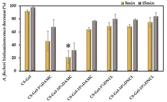 Decrease in the A. fischeri bacteria bioluminescence upon contact with the prepared films; n = 2; mean ± SD (SD—standard deviation); statistical significance is indicated with an asterisk: * p < 0.05.