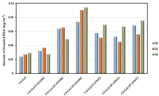 Assessing the HSA adsorption capacity with the obtained material is a crucial step in the design of dressing materials. During the contact of the obtained biofilms with blood, proteins are adsorbed, which in turn causes the adhesion and activation of blood elements [91]. According to the literature reports, the dressing material should be highly able to interact with proteins [92]. The amount of adsorbed HSA after the full incubation time is presented in Figure 12 and Table S1, and it ranges from 0.024 to 0.054 mg/cm2 after 1 h and 24 h, respectively. As can be seen, all materials can interact with this protein. In the case of a series of samples cross-linked with DAMC, an increase in the amount of cross-linking agent added causes an increase in the amount of adsorbed protein. Additionally, extending the incubation time increased the amount of adsorbed protein. The most significant amount of adsorbed protein after 3 h incubation was noted for the CS-Gel-15%DAMC sample, where the amount increased from 0.029 to 0.094 mg/cm2 compared to the starting material (CS-Gel). It is worth noting that this is about a three times higher amount of adsorbed protein. After the fourth hour of incubation, HSA was desorbed.