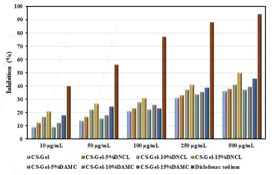 The neat chitosan-gelatin samples with different concentrations showed similar anti-inflammatory properties as early described by Sakthiguru et al. [95]. Moreover, it should be pointed out that the cross-linking process improved the results of inhibition denaturation of BSA for all obtained samples. The improvement in these properties is more apparent for a series of samples cross-linked with DNCL. The highest inhibition value for CS-Gel-15%DNCL with a concentration of 500 µg/mL was observed. It should also be emphasized that an increase in the concentration of samples and the amount of added cross-linking agents improves the anti-inflammatory properties of the obtained films. The inhibition values of obtained samples are more than half lower than for diclofenac sodium. However, these results are promising from the point of view of practical applications, for example, in wound dressings.