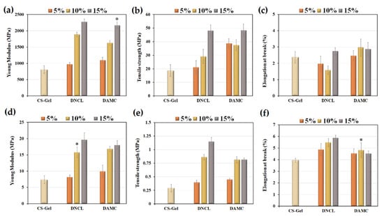 The value of Young’s modulus in (a) dry and (d) wet conditions, tensile strength in (b) dry and (e) wet conditions, and elongation at break in (c) dry and (f) wet conditions; n = 5; mean ± SD (SD—standard deviation); statistical significance is indicated with asterisks: * p < 0.05.