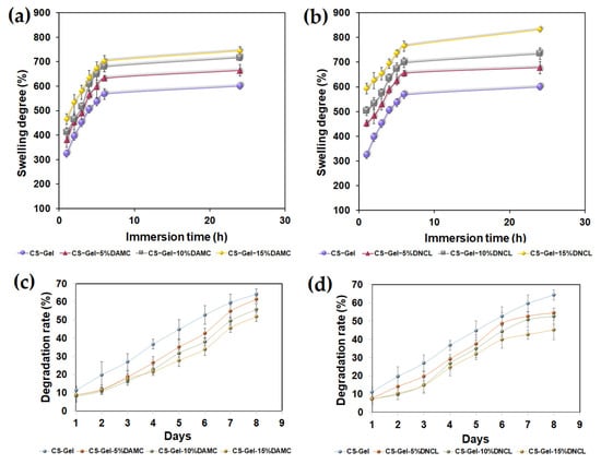 The swelling degree of chitosan-gelatin films cross-linked with (a) DAMC and (b) DNCL, and degradation rate of chitosan-gelatin materials cross-linked with (c) DAMC and (d) DNCL; n = 3; mean ± SD (SD—standard deviation), no statistical significance at p < 0.05.