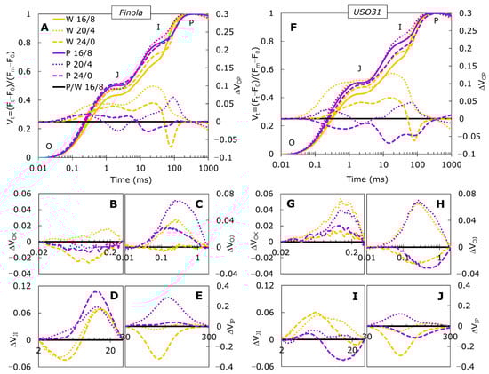 Fast chlorophyll a fluorescence (ChlF) measurements were performed on both Cannabis cultivars grown under purple (P) and white light (W), exposed to 20/4 and 24/0 photoperiods and compared to the 16/8 photoperiod as a control. The OP normalized curves (Figure 1A,F) showed major differences between treatments at J and I steps for both cultivars. The ΔVt was calculated as the difference between photoperiods under white and purple light for each cultivar individually, and it was used as a reference for data normalization. The ΔVOP (Figure 1A,F) revealed additional differences in range from 0.02 to 30 ms, which corresponds to L-, K-, and H-bands with amplitudes more pronounced in the USO31 cultivar. Positive amplitudes are usually associated with the nutrient deficiency [,], heavy metal stress [], salt stress [,], drought [], and low temperature []. Growing plants at W24/0 caused the appearance of positive amplitudes in both cultivars, with the exception of a negative peak around 30–300 ms, which corresponds with the G-band. Reduction at the 30–300 ms peak reflects the ability of re-reduction of plastocyanin and P700* in PSI [], meaning that prolonged exposure to light led to the loss of capacity for photochemical reduction of QA and, consequently, lowered the transfer of electrons to the PSI acceptor side [].