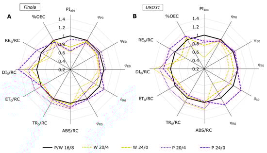Moreover, the CVA analysis (Figure 3A,B) and the inspection of the coefficient weights (Table 1) confirmed that log γRC/(1 − γRC) and log δR0/(1 − δR0) considerably determined photosynthetic reactions induced by W24/0 treatment in both cultivars. On the contrary, log φP0/(1 − φP0) and log ψE0/(1 − ψE0) influenced the negatively photosynthetic reaction induced by P24/0 treatment in both cultivars. It could be also observed that photosynthetic activity in W16/8 in both cultivars was also mostly determined by log γRC/(1 − γRC) and log δR0/(1 − δR0).