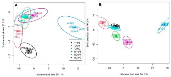 Cannonical variate analysis (CVA) representing the explanatory variables within Cannabis cultivars Finola (A) and USO31 (B) exposed to 16/8, 20/4, and 24/0 photoperiods and grown under white (W) and purple (P) light. Points represent values for each treatment. Ellipses around the different groups represent the 95% confidence intervals.