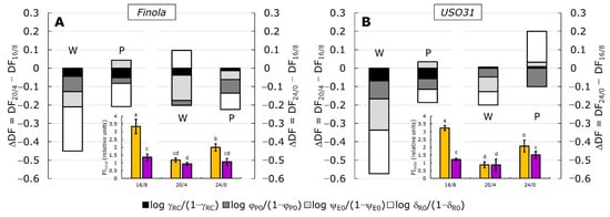 Relative changes in the difference in driving forces (ΔDF) measured in Cannabis cultivars Finola (A) and USO31 (B) exposed to 16/8, 20/4, and 24/0 photoperiods and grown under white (W) and purple (P) light. Stacked columns are showing the difference in DFs at 20/4 (left columns per panel) and 24/0 (right columns per panel) photoperiods minus the DF at 16/8 (control). Each DF is calculated by summing up their partial driving forces: log γRC/(1 − γRC), log φP0/(1 − φP0), log ψE0/(1 − ψE0), and log δR0/(1 − δR0). The performance index for energy conservation from exciton to the reduction of the final electron acceptor at PSI, PItotal for each cultivar is shown in the inserts. Yellow bars represent plants grown under white light, while purple bars represent plants grown under purple light. Results are shown as the mean of five independent measurements (n = 5) ± SD. Different letters represent a significant difference at p ≤ 0.05 (ANOVA, LSD).
