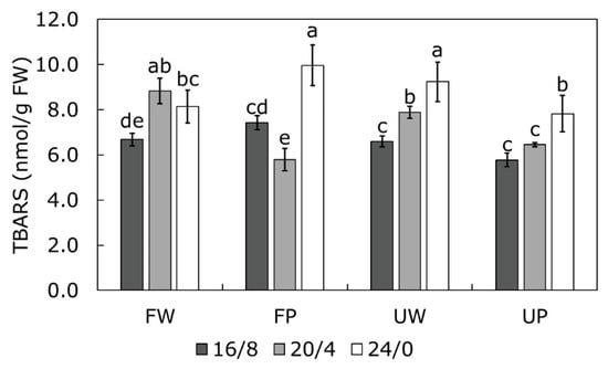 Changes in content of thiobarbituric acid reactive substances (TBARS, nmol/g FW) measured in Cannabis cultivars Finola (F) and USO31 (U) exposed to 16/8, 20/4, and 24/0 photoperiods and grown under white (W) and purple (P) light. Results are shown as mean of five independent measurements (n = 5) ± SD. Different letters represent significant differences at p ≤ 0.05 (ANOVA, LSD); LSD = 0.187.