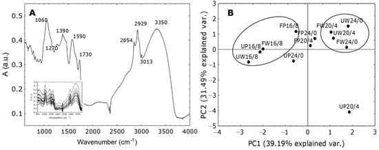 Characteristic bands (range 400–4000 cm−1) of FT-IR spectra measured in the Cannabis samples. (A) shows characteristic peaks marked with numbers. The FTIR spectrum was recorded using 12 scans at a resolution of 2 cm−1 in the wavenumbers range from 400 to 4000 cm−1. The insert represents the FTIR spectral analysis in Cannabis cultivars for each treatment. PCA (B) represents the explanatory FT-IR variables between and within Cannabis cultivars Finola (F) and USO31 (U) exposed to 16/8, 20/4, and 24/0 photoperiods and grown under white (W) and purple (P) light. Points represent values for each treatment. The analysis provides the score results provided in the insert.